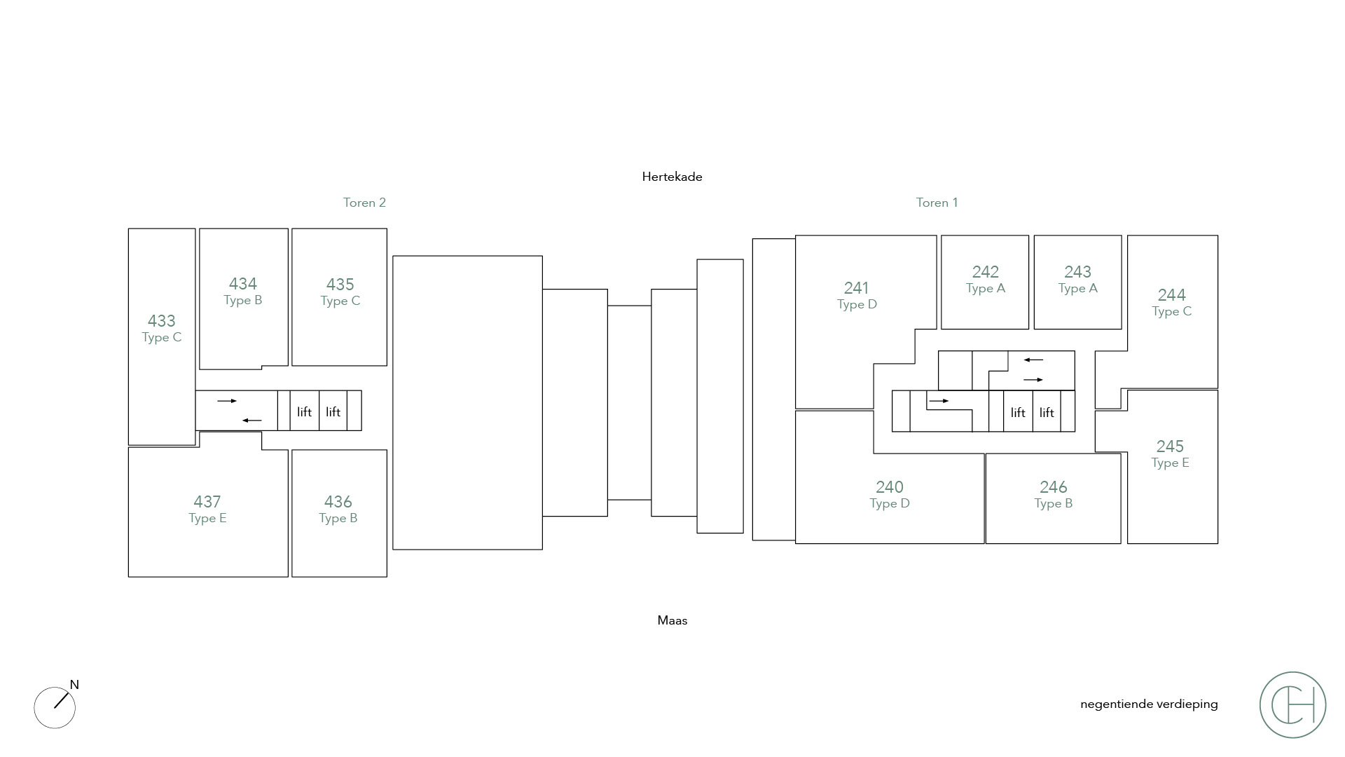 De type B appartementen zijn aangename en lichte tweekamerappartementen van 50 tot ongeveer 70 vierkante meter groot. Veel van deze appartementen bevinden zich op de hoek van een van de torens, waardoor je zowel uitzicht hebt op de Maas als op het stadscentrum. Dankzij de hoekligging geniet je hier van extra veel lichtinval. De appartementen hebben een ruime slaapkamer met een mooie badkamer, inclusief een moderne douche en wastafel. De woonkamer en open keuken vormen één geheel, met voldoende ruimte voor een comfortabele zithoek en een gezellige eethoek. En vanaf je eigen balkon of loggia geniet je hier altijd van een prachtig uitzicht!