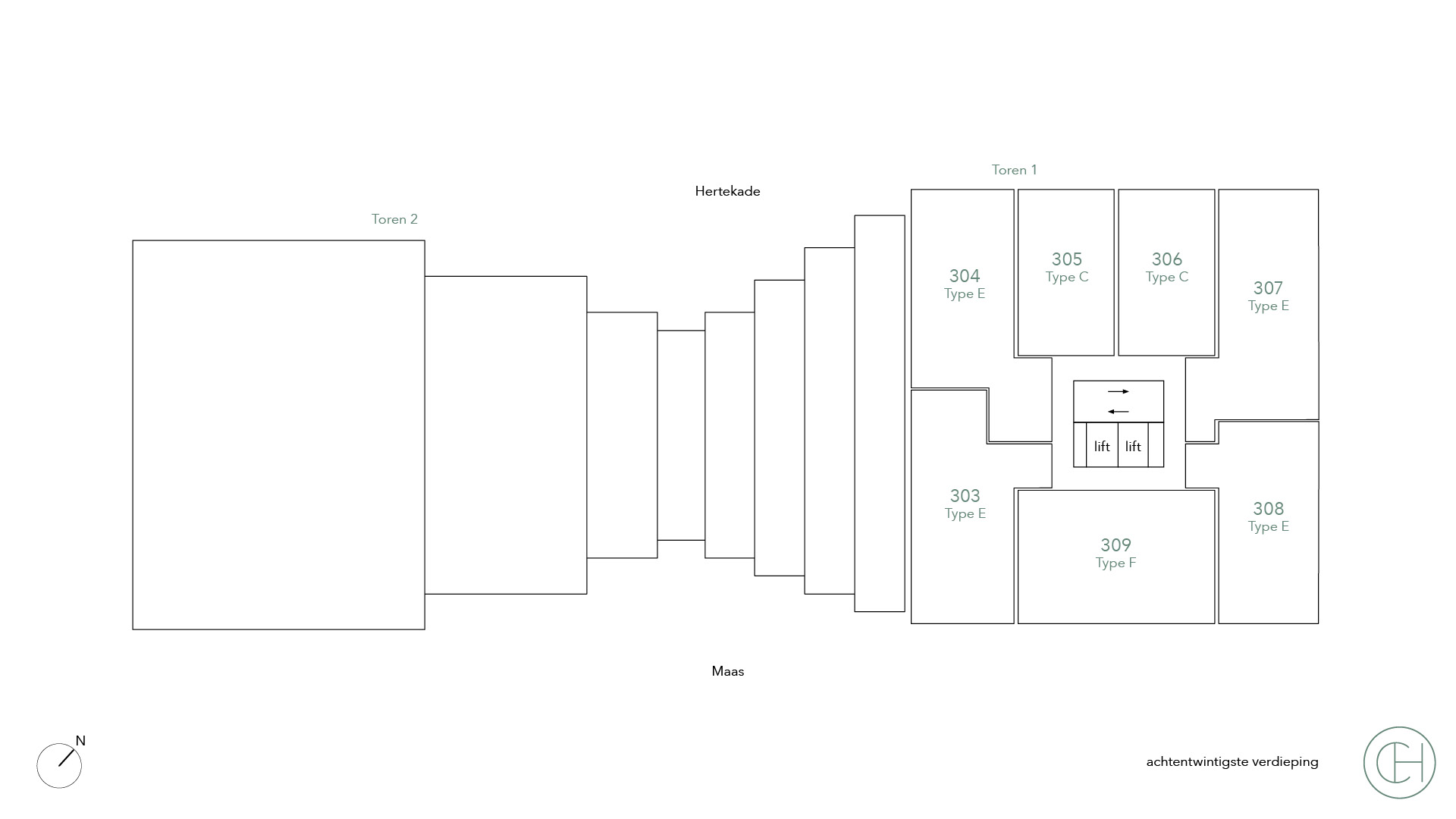 De appartementen type E variëren in grootte van 75 tot maar liefst 140 vierkante meter. Deze luxe appartementen met drie kamers zijn van alle gemakken voorzien. Met twee ruime slaapkamers met een eigen badkamer is er voldoende ruimte, privacy en comfort. De ruime woonkamer biedt plaats aan een gezellige zithoek, en de keuken is uitgerust met moderne apparatuur. In sommige appartementen is de keuken deels afgesloten, wat de mogelijkheid biedt voor een aparte eetkamer. Een mooi balkon met een prachtig uitzicht maakt deze appartementen helemaal compleet. Een ideale plek om te ontspannen na een lange werkdag of om samen met vrienden van een gezellige borrel en de prachtige skyline van Rotterdam te genieten.