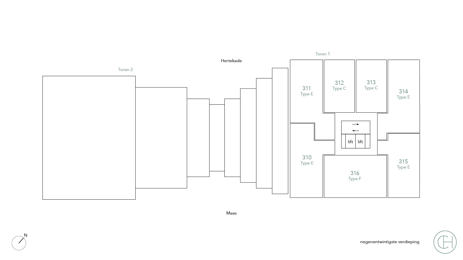De appartementen type E variëren in grootte van 75 tot maar liefst 140 vierkante meter. Deze luxe appartementen met drie kamers zijn van alle gemakken voorzien. Met twee ruime slaapkamers met een eigen badkamer is er voldoende ruimte, privacy en comfort. De ruime woonkamer biedt plaats aan een gezellige zithoek, en de keuken is uitgerust met moderne apparatuur. In sommige appartementen is de keuken deels afgesloten, wat de mogelijkheid biedt voor een aparte eetkamer. Een mooi balkon met een prachtig uitzicht maakt deze appartementen helemaal compleet. Een ideale plek om te ontspannen na een lange werkdag of om samen met vrienden van een gezellige borrel en de prachtige skyline van Rotterdam te genieten.